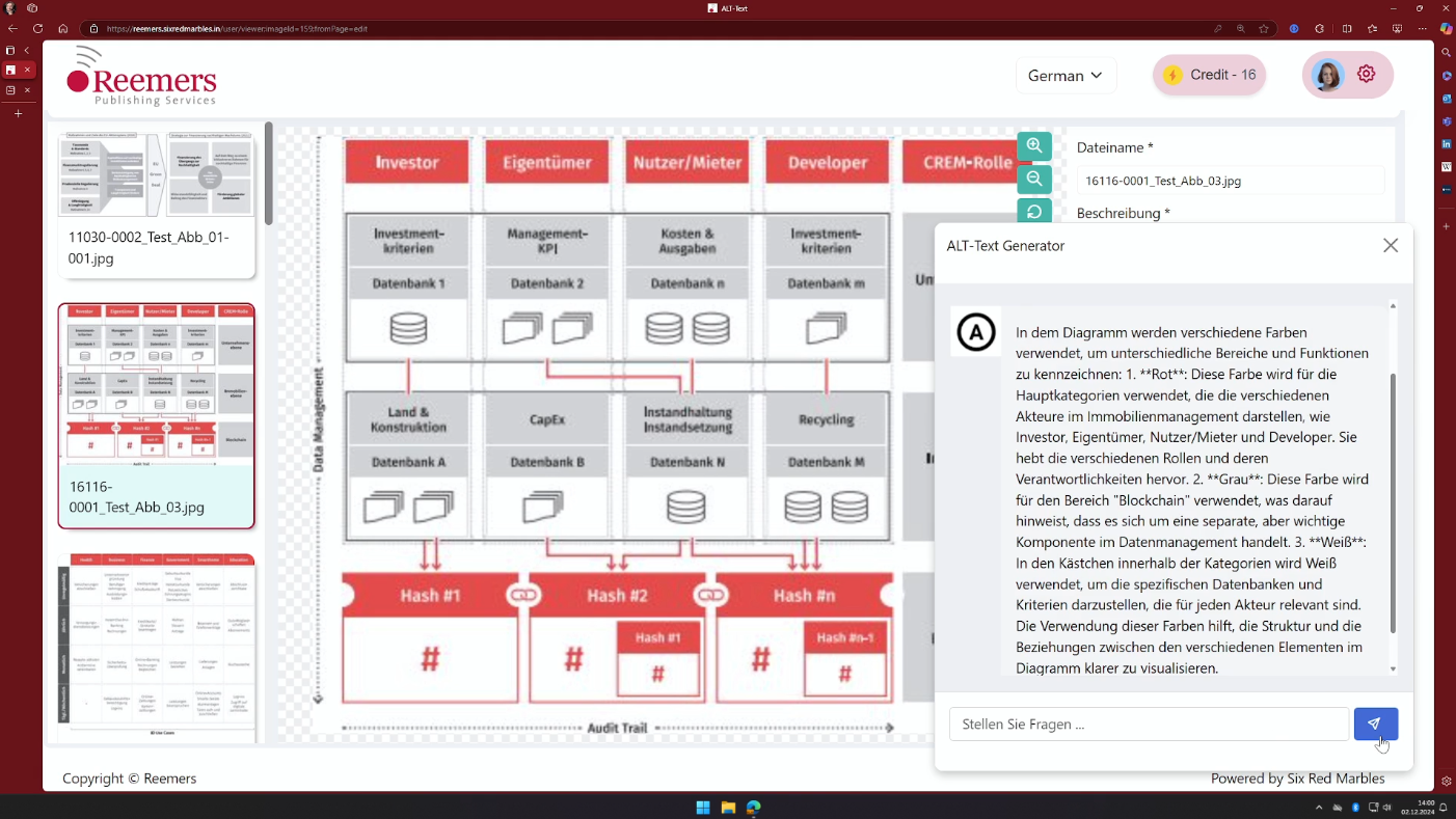 Reemers gibt Ihnen die All-in-One-Lösung an die Hand: Laden Sie Ihre Bilder stapelweise in unseren Service hoch und lassen Sie durch eine leistungsstarke Künstliche Intelligenz die textliche Darstellung, also die Beschreibung der Bildinhalte einfach anfertigen – automatisch. Die generierten Beschreibungen können beliebig modifiziert und mit weiteren Schlagworten versehen werden. Die Künstliche Intelligenz, die bereits die Alternativtexte generiert hat, lässt sich auch über den integrierten Chatbot dazu nutzen, Textvorschläge mit anderen Schwerpunkten oder Tonalitäten zu erzeugen. Nach Freigabe können die Texte als Excel-Datei oder in einem anderen strukturierten Format exportiert werden. Dadurch ist eine problemlose Weiterverarbeitung in Ihrer Medienvorstufe möglich.